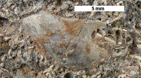 linke Klappe, Maßstab 5mm. Fundort: Altensteiner Höhle bei Schweina. Die im englischen Zechstein aufgestellten Arten B. sedgwickiana KING (1848) und B. binneyi BROWN (1841) sind mit den deutschen Formen identisch, d.h. „homonym“. Das Vorrecht gilt aber immer dem ältesten Namen - der Erstbeschreibung. Jüngere Homonyme werden automatisch ungültig wenn sich herausstellt, daß die gleiche Art schon einmal beschrieben wurde und bereits einen Namen besitzt. Manchmal ist die Sache mit den wissenschaftlichen Namen aber komplizierter. So auch in diesem Fall: Der Name Avicula (heute: Bakevellia) antiqua den MÜNSTER (1836) vergeben hatte, war schon durch A. antiqua DEFRANCE (1816) belegt. Damit fällt dem nächstältesten Synonym (B. binneyi BROWN (1841)) der Vorrang zu. LOGAN (1967) unterscheidet neben B. binneyi und B. ceratophaga noch eine B. bicarinata. Letztere wird von den meisten Autoren aber nur als eine „Variation“ der Art ceratophaga aufgefasst.